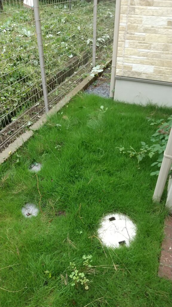 人工芝の施行前は、伸びてきたみどりの芝生や雑草で、マスが隠れてしまっています。