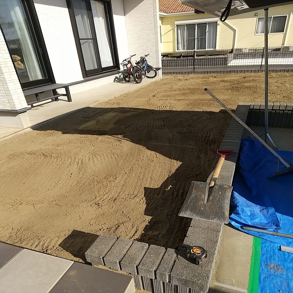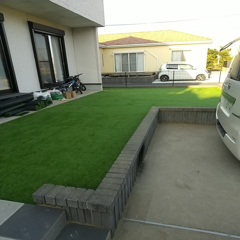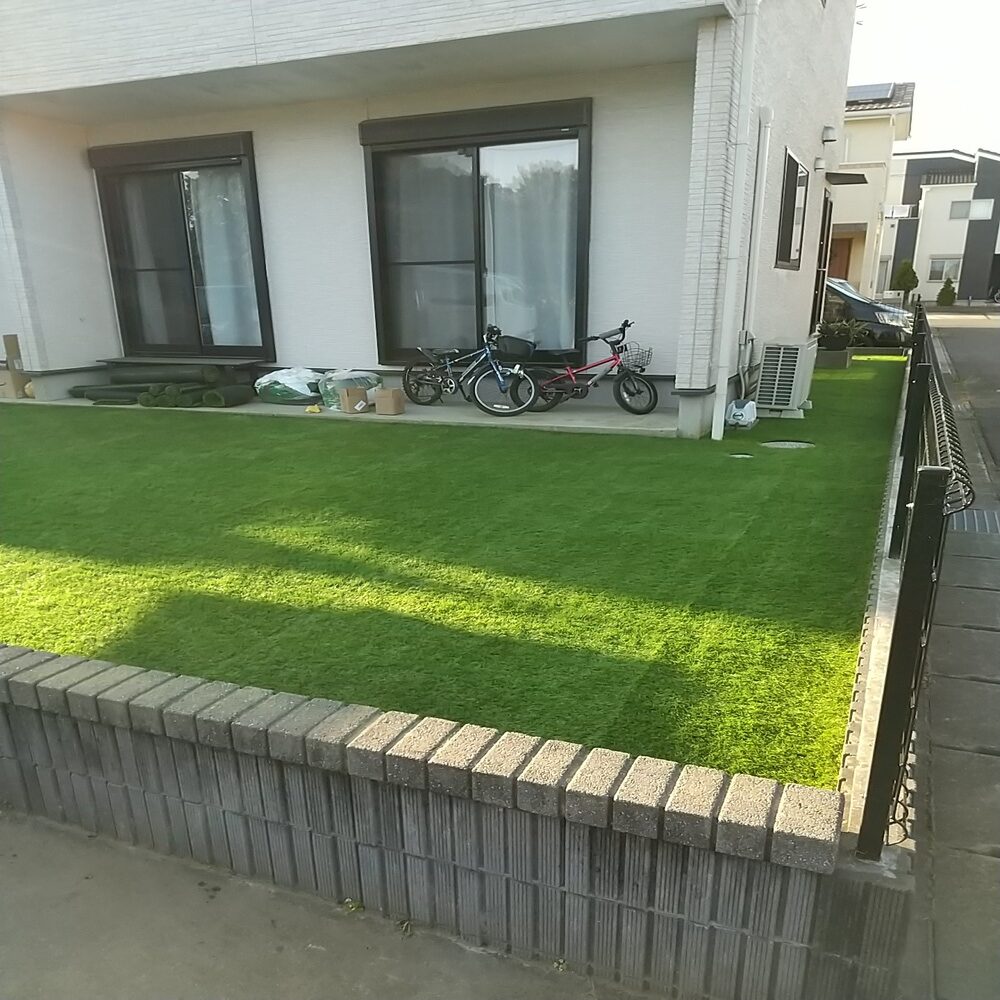もとは芝生のお庭でしたが、雑草対策やお手入れが大変なため人工芝に変更をご希望されていました。