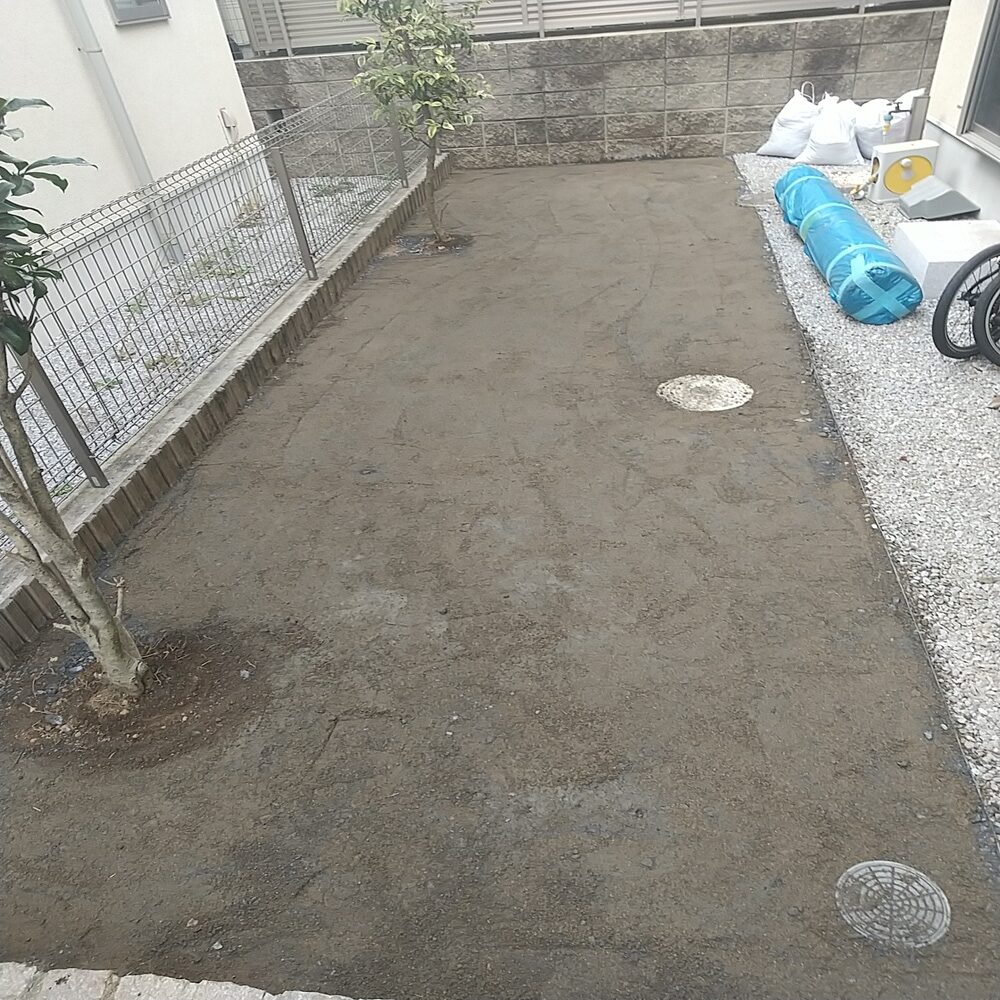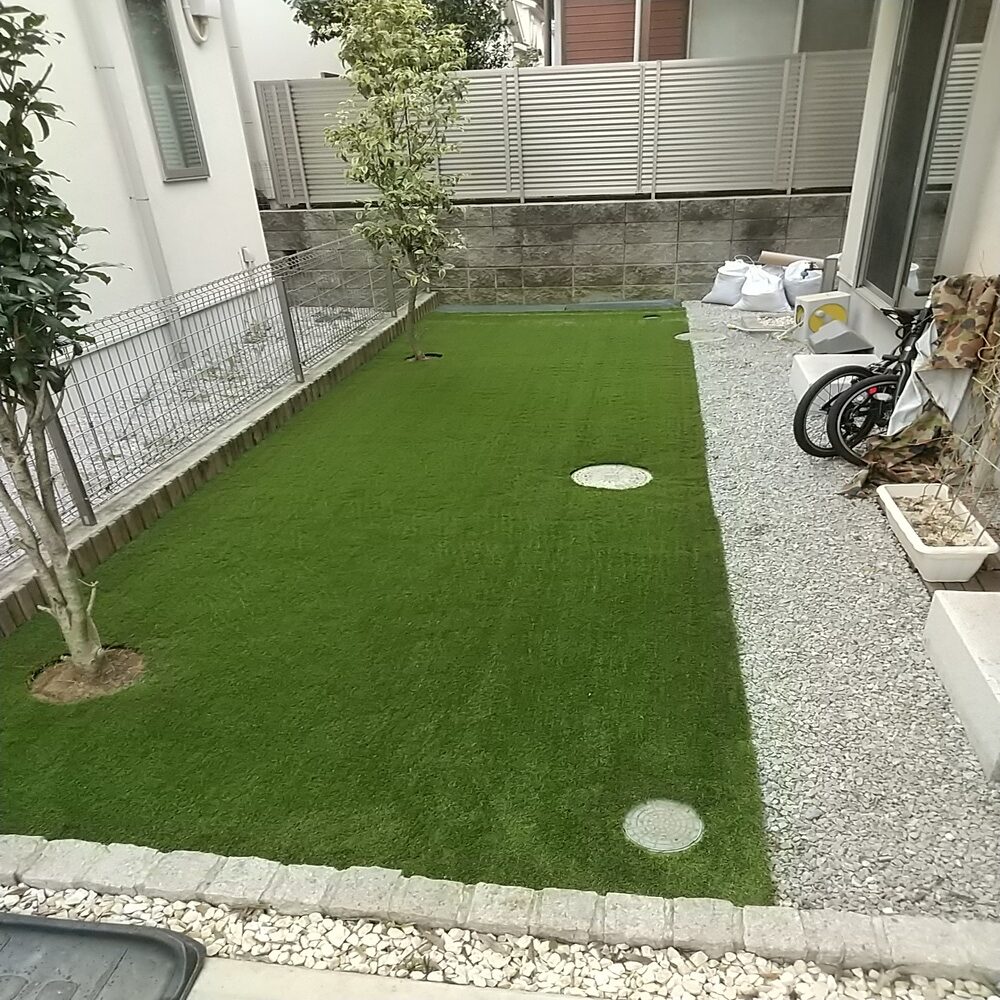 きっちり下地を整えてから、防草シートと人工芝を施工しました。