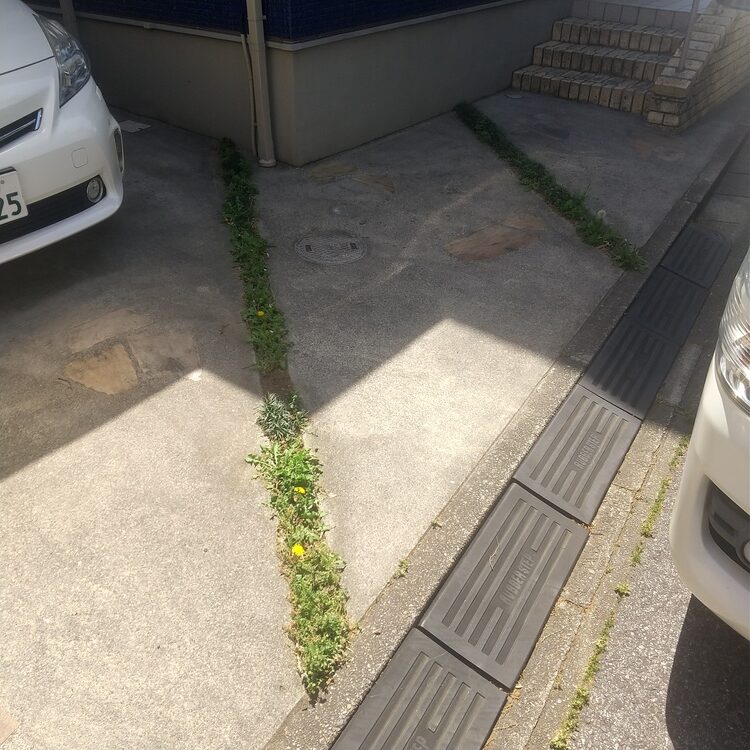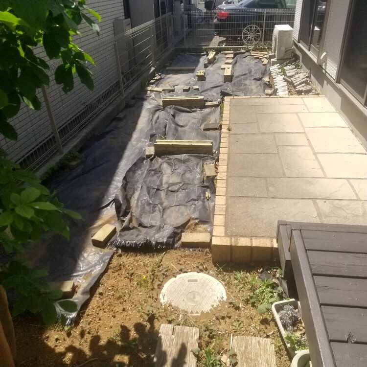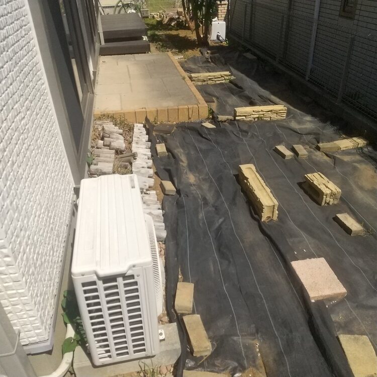 お庭は数年前にDIYで防草シートを敷いたようですが、風で飛ばないようにブロックが重石になっていました。