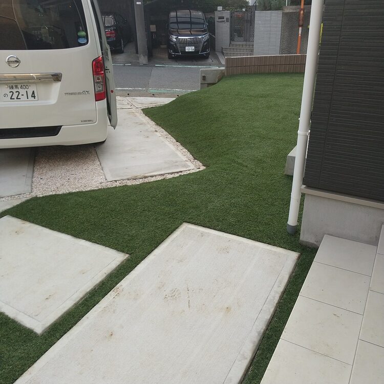 千葉県東金市の施工事例になります! 今回は当店自慢のSターフは使用せず、市販品の施工になります。 もとは芝生のお庭でしたが、雑草対策やお手入れが大変なため人工芝に変更をご希望されていました。 しかしご覧の通り画像には芝生 …