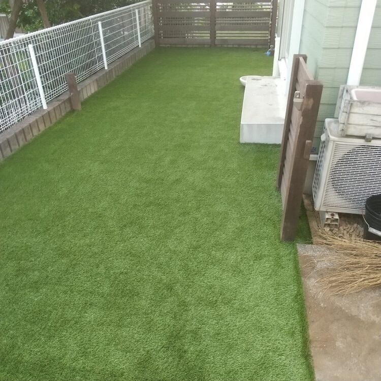 今回は所沢市での作業となります。 使用した人工芝は品質と価格のバランスが良い「Sターフ30mm」です。 現状はDIYで敷いた防草シートになります。 シート撤去後に整地+転圧をかけ、改めて防草シートと人工芝を施工しました。 …
